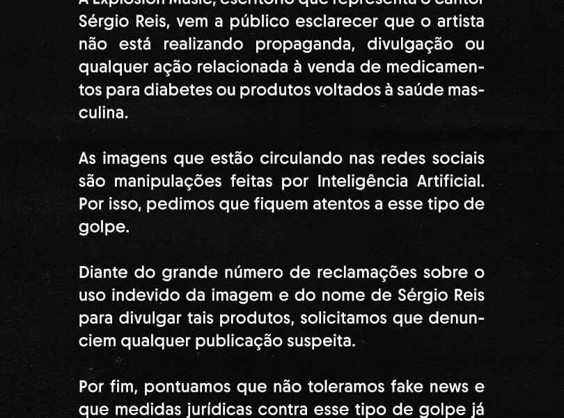 A Explosion Music, escritório que representa o cantor Sérgio Reis, vem a público esclarecer que o artista não está realizando propaganda, divulgação ou qualquer ação relacionada...