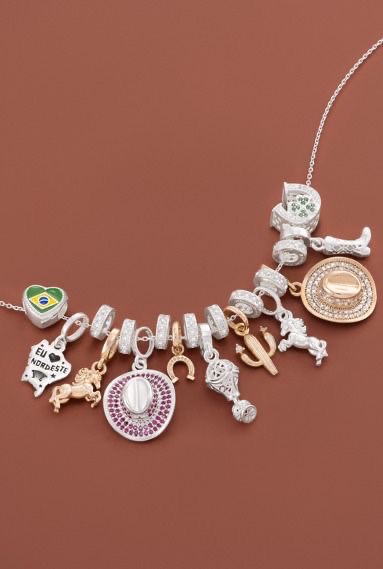 São brincos, anéis, pingentes, pulseiras e gargantilhas com design autoral e releituras modernas de ícones como ferradura, cavalo, botas e balões. Os destaques vão do anel cabeça de cavalo ao pingente chapéu e cavalo 3D, passando por maxi anéis, berloques com bandeira do Brasil e sanfona, além de chokers e colares com detalhes em couro.