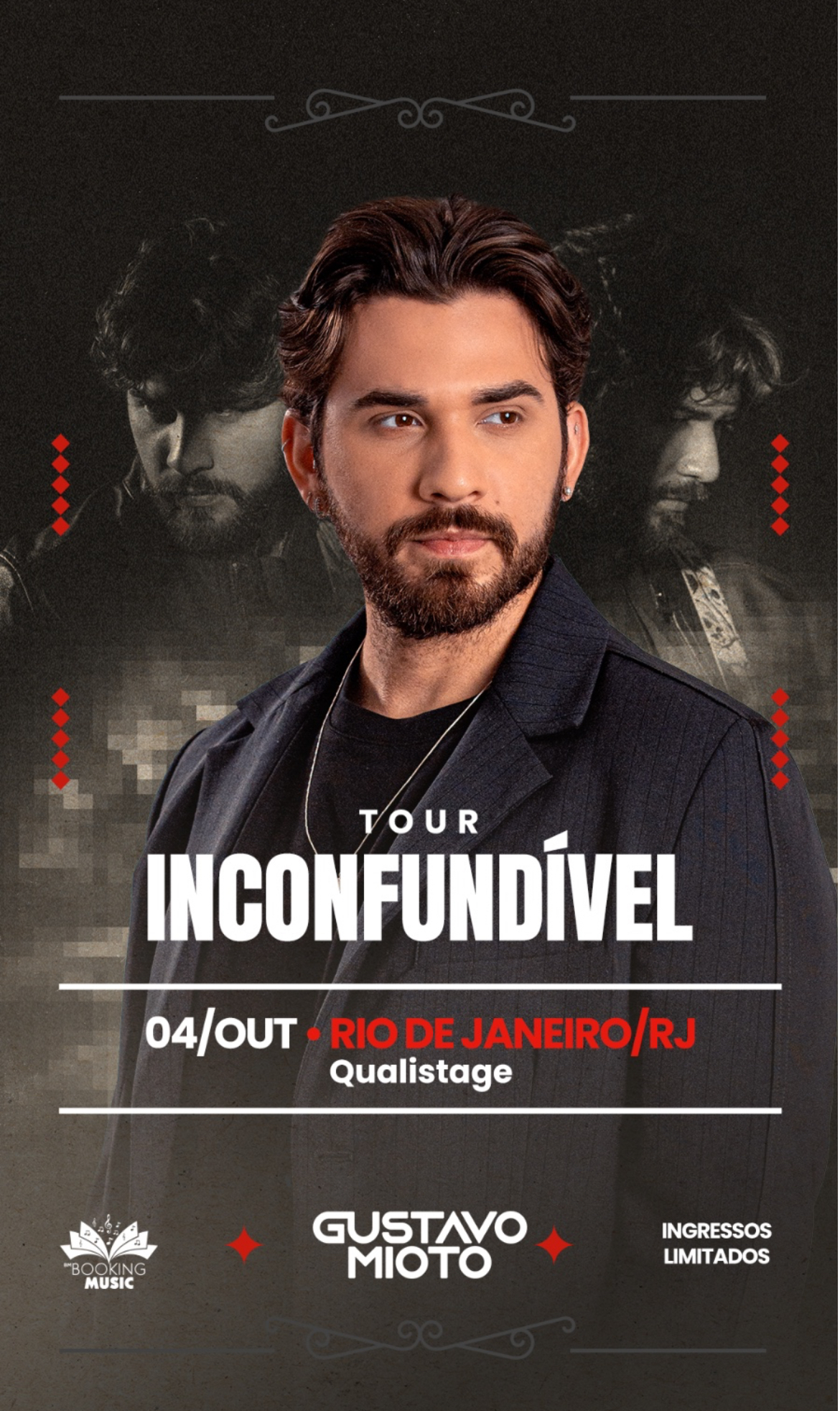 Gustavo Mioto apresenta ao público carioca, pela primeira vez, o espetáculo de sua turnê “Inconfundível”, num show intimista e exclusivo no Qualistage, no sábado, dia 4 de outubro. A casa abrirá às 19h30, com início previsto para as 21h30. Esta é uma oportunidade única: restam os últimos ingressos para esta noite memorável.